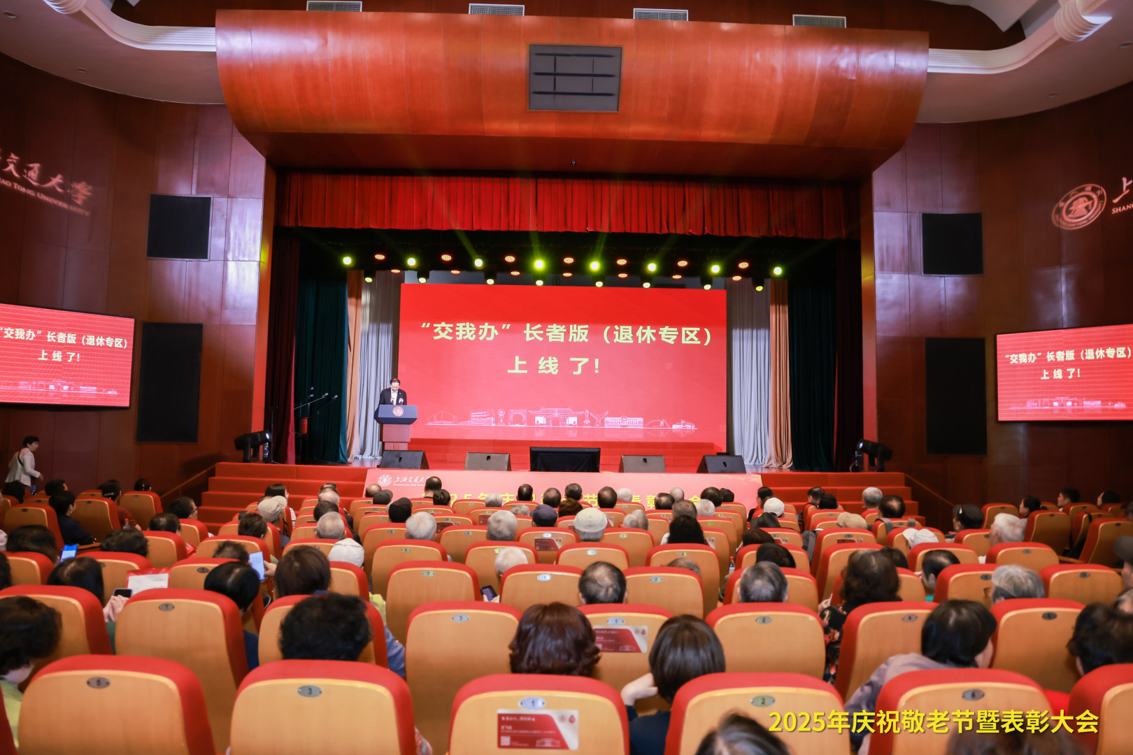 10月29日下午,上海交通大学2025年庆祝敬老节暨表彰大会在徐汇校区文治堂召开。上海市高校退管会常务副主任李玉华,上海市高校退管会副秘书长、办公室主任孙大卫,华东师范大学老干部党委书记、老龄办主任张军出席;上海交通大学校长、党委副书记丁奎岭,校长助理、校党政办公室主任杨明,党委组织部、校工会等部门领导,离退休先进集体和先进个人代表、主题活动获奖代表,部分二级单位负责人、分管离退休工作的负责同志,老龄工作部门相关负责同志、离退休教职工代表等参加会议。会议由校务委员会专职副主任、老龄工作委员会常务副主任顾锋主持。