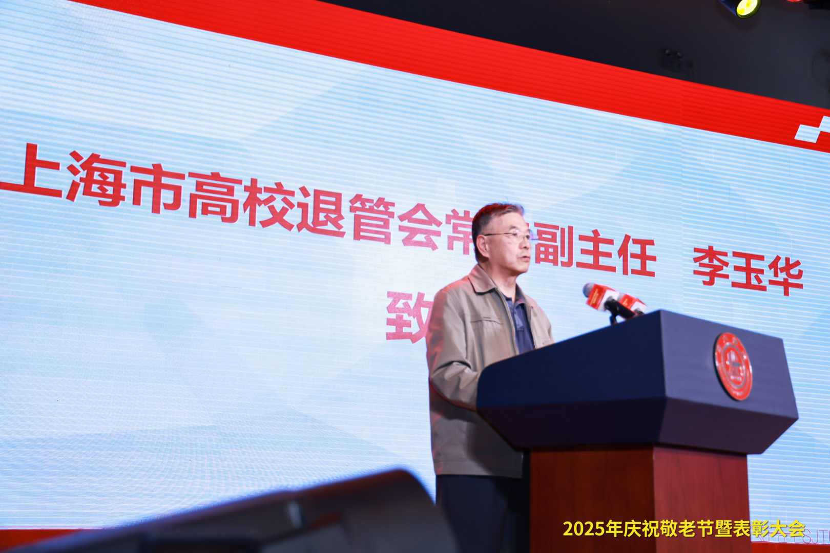 李玉华在致辞中代表上海市高校退管会向广大老同志致以亲切的问候和节日的祝福,向高度重视和关心老龄工作的交大各级领导及在一线辛勤付出的为老服务工作者表示崇高敬意和衷心感谢。他表示,上海市高校退管会始终把为党的事业增添正能量作为工作的价值取向,引导老同志们共同为实现中华民族伟大复兴的中国梦做出积极贡献。上海交通大学有着丰富的历史文化底蕴,在学校党政领导下,深入学习贯彻落实党的二十大精神,发扬敬老爱老的传统美德,历年来开展了一系列包括“敬老月”系列活动、荣休典礼、离退休教职工党史校史知识学习竞赛等引领思想、增进福祉、丰富精神文化生活的品牌活动,为推动上海高校老龄事业全面协调可持续发展作出了积极贡献。