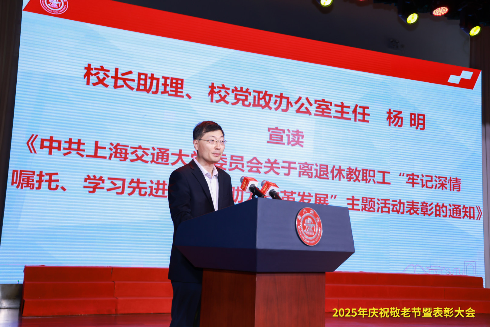 杨明宣读《中共上海交通大学委员会关于开展离退休教职工“牢记深情嘱托、学习先进典型、助力改革发展”主题活动的通知》。