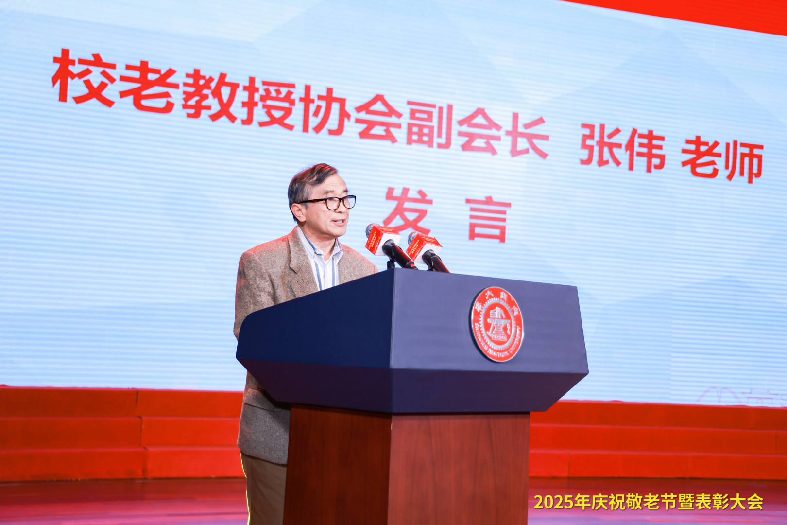 校老教授协会副会长张伟畅谈退休生活的“三重馈赠”:“卸任”与“上任”的交响、“讲授”与“鼓掌”的默契、“运动”与“宁静”的平衡。他分享了退休后在公益服务中实现老有所为、为国家学校发展进步喝彩以及享受兼具活力与安宁的生活的体会,深情表达了对学校一直以来的温暖关怀的由衷感激。
